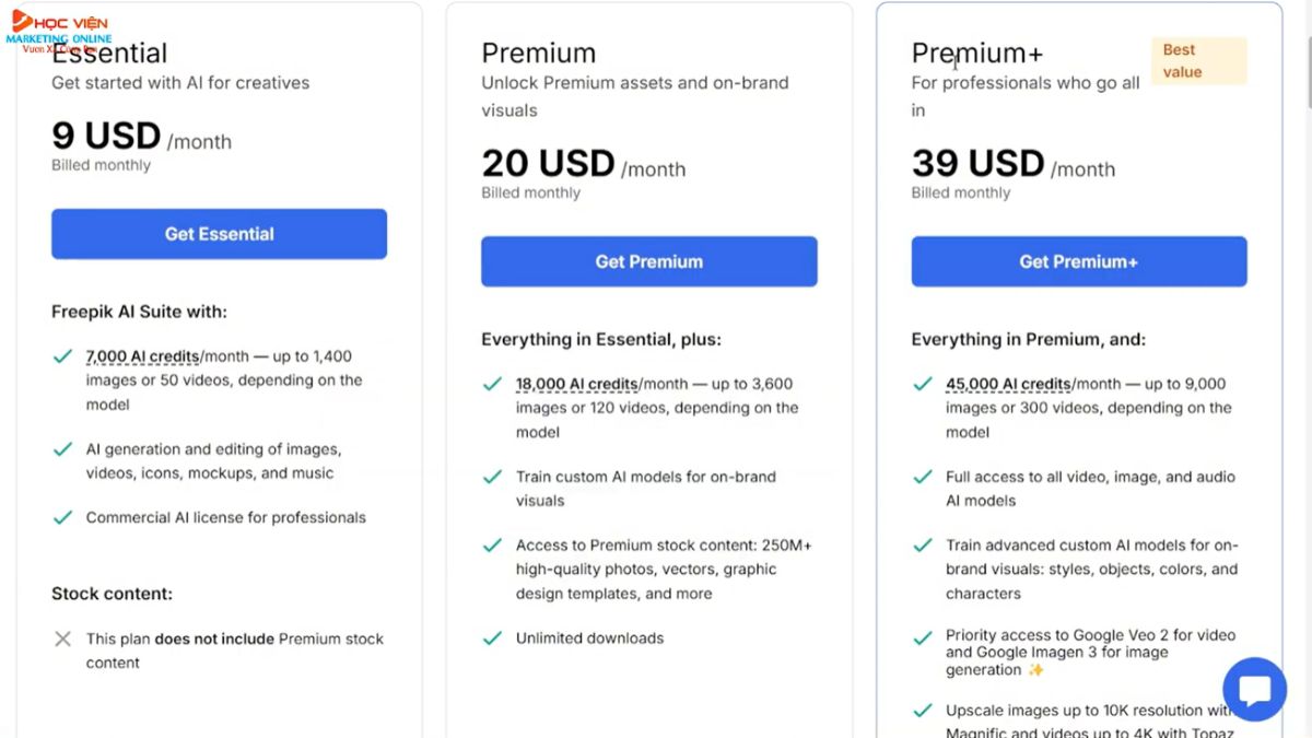 Freepik cung cấp 3 gói Essential, Premium, Premium + đa dạng cho mọi đối tượng sử dụng: