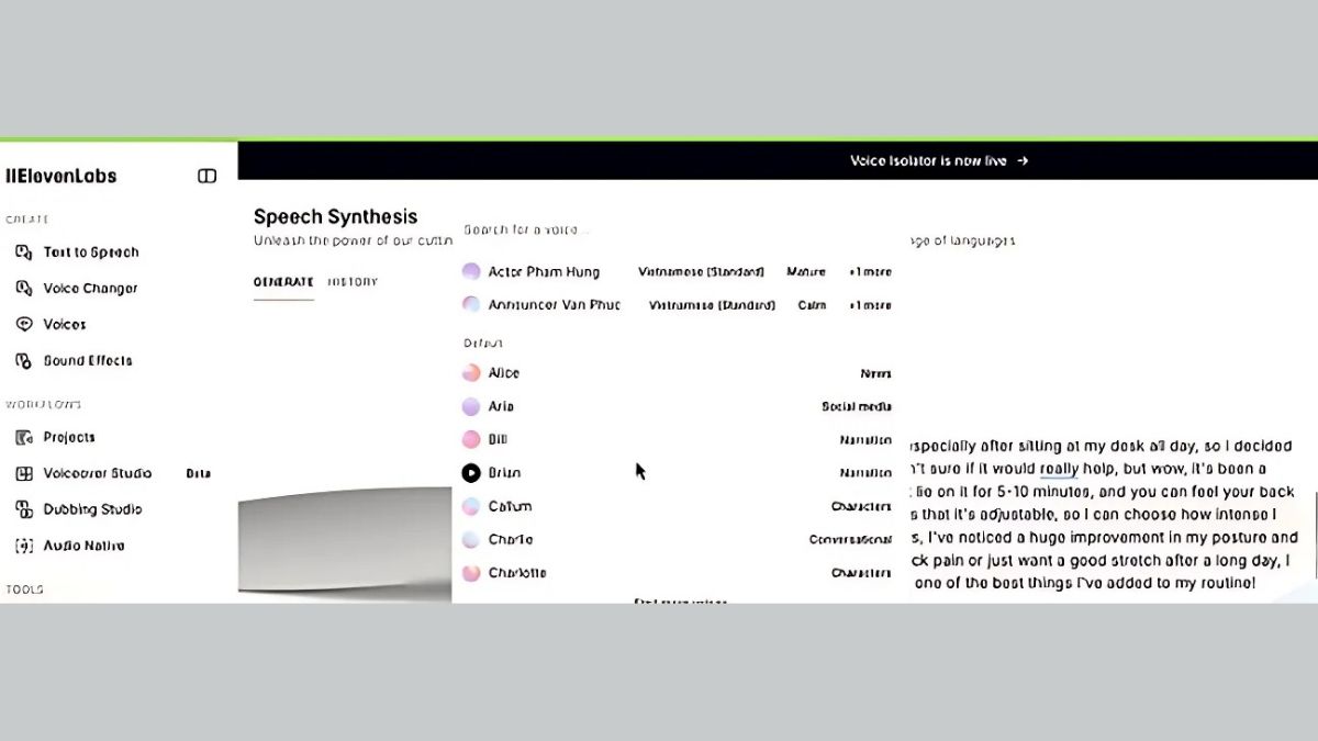Bước 3: Truy cập Elevenlabs.io và chọn Text to Speech, dán đoạn văn mô tả. Sau đó, chọn giọng nói cho nhân vật. Tiếp theo, bạn nhấp vào “Generate” và tải về.