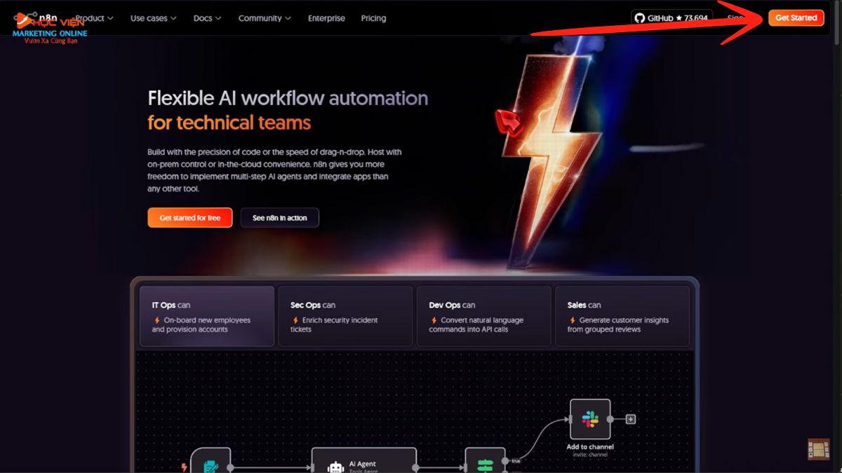 - Để sử dụng, bấm vào phần "Sử dụng miễn phí" → "Bắt đầu miễn phí với n8n Cloud".